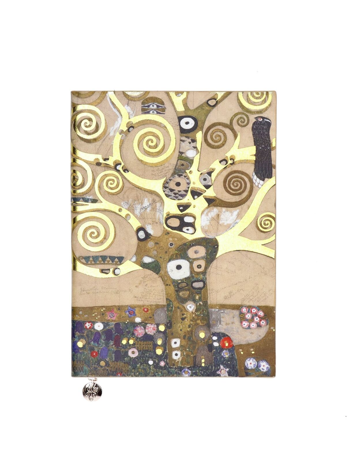 Elegantni zvezek A5 z motivom Klimtovega drevesa življenja, ki navdihuje ustvarjalnost.