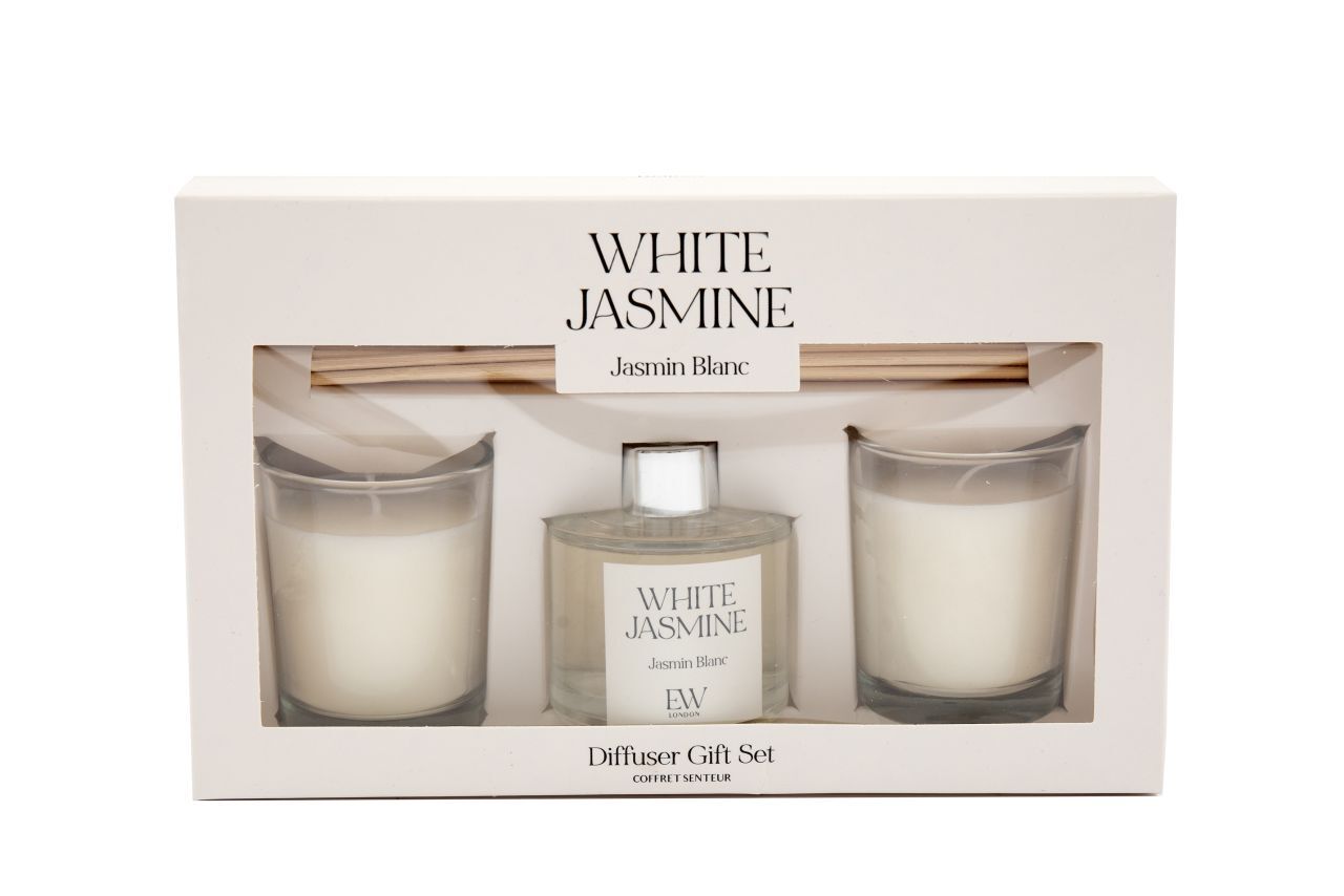 Darilni set za ljubitelje prijetnih vonjav. Vsebuje difuzor in dve dišeči sveči z vonjem belega jasmina. Idealno za sprostitev doma ali kot posebno darilo.