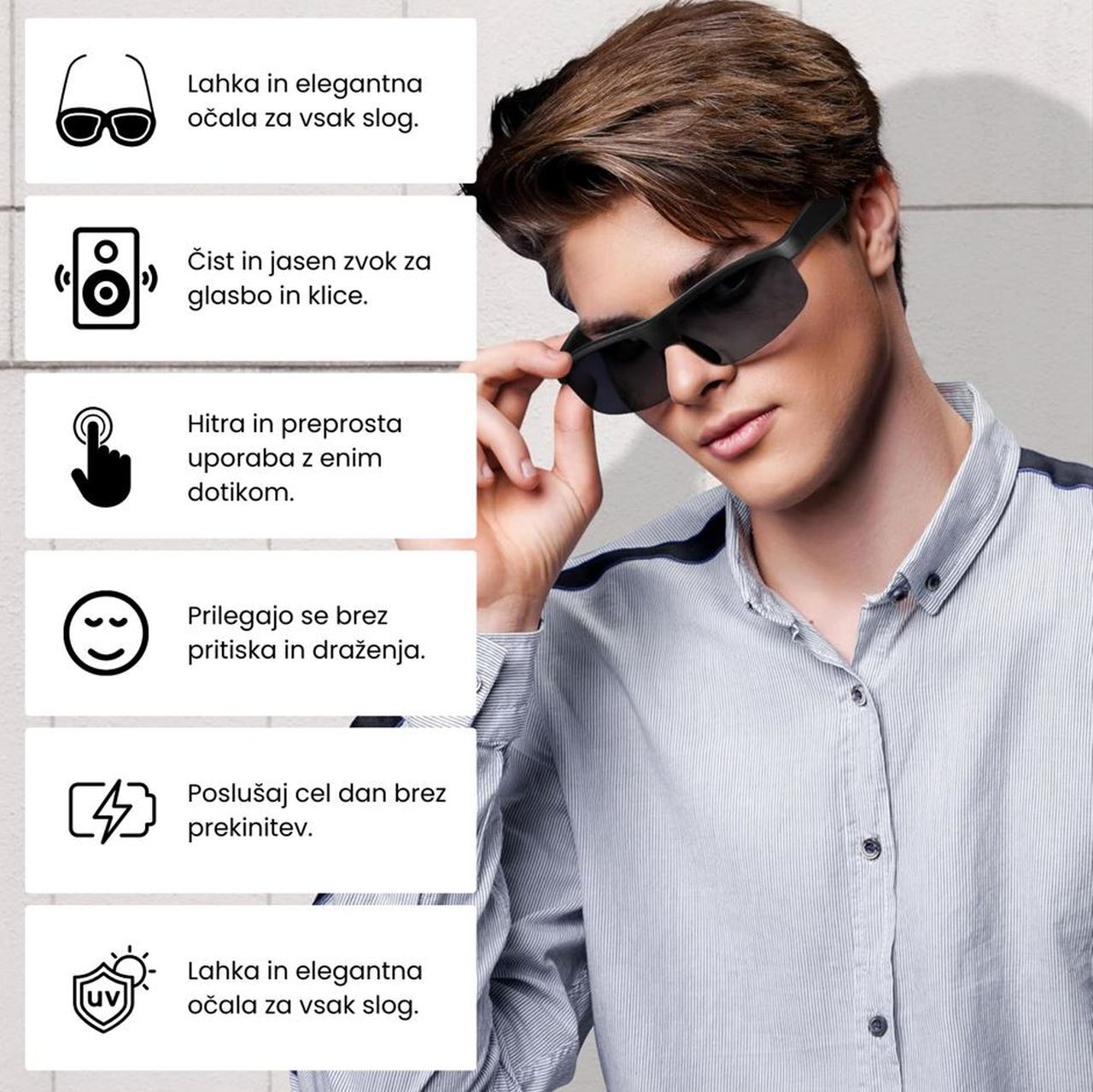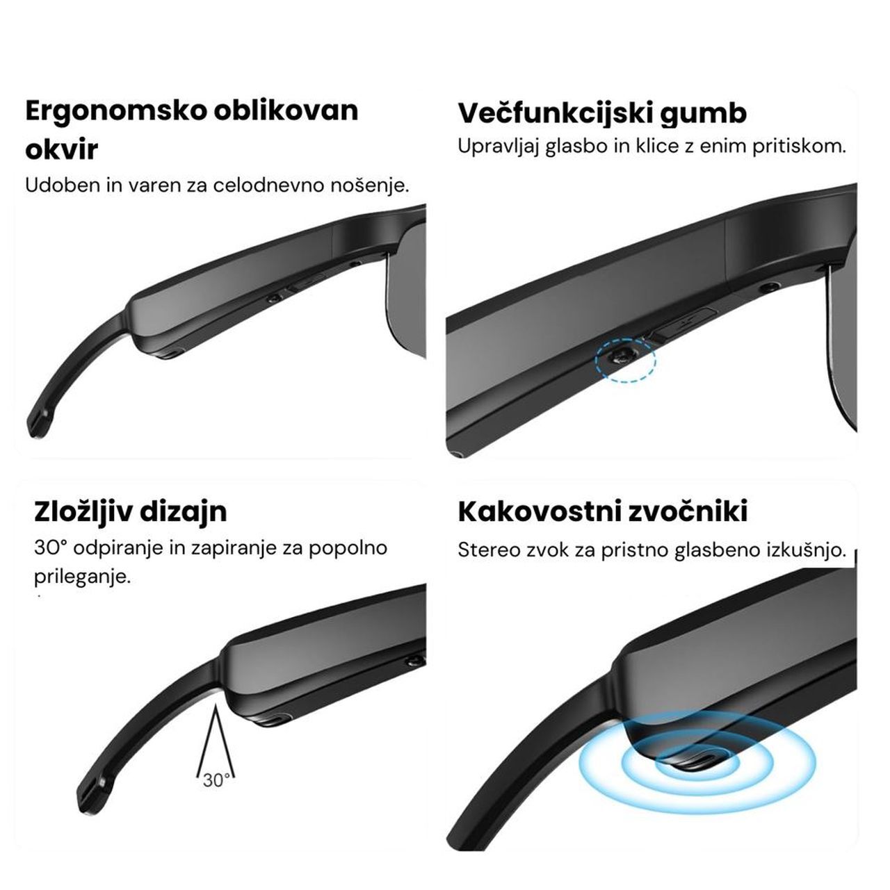 Moderen dizajn očal poskrbi, da ste vedno v trendu. Uživajte v kombinaciji stila in funkcionalnosti, ki vam omogoča, da izgledate dobro, medtem ko uživate v glasbi.