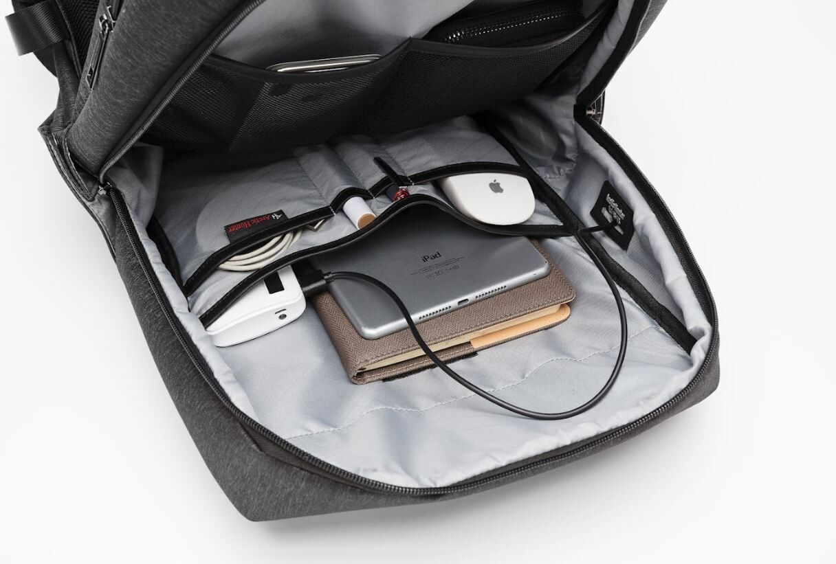 Nahrbtnik ima vgrajen USB priključek, ki omogoča enostavno polnjenje vaših naprav med potovanjem. Tako boste vedno povezani in pripravljeni na delo, kar vam daje občutek varnosti in pripravljenosti.