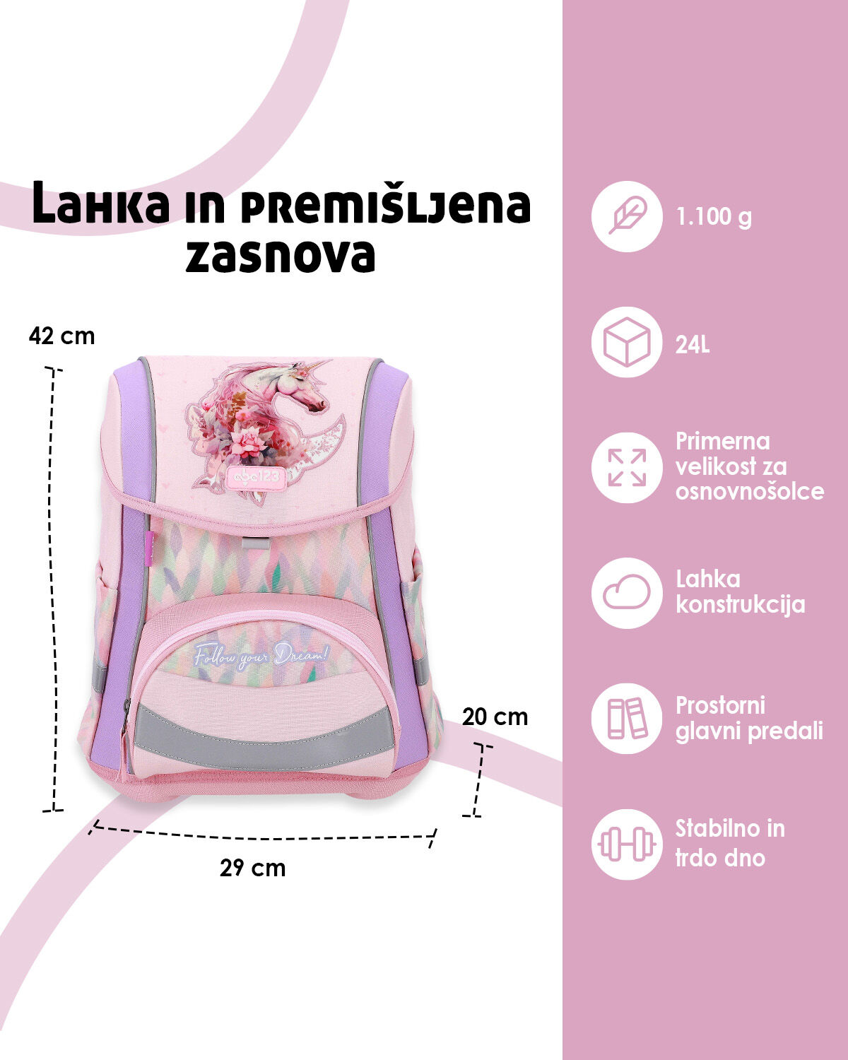 Motiv samoroga prinaša nasmeh na obraz vašega otroka in spodbuja domišljijo. Ta čaroben dizajn omogoča, da se vaš otrok počuti posebnega in edinstvenega med prijatelji. Ustvari veselje ob vsakem odprtju torbe.