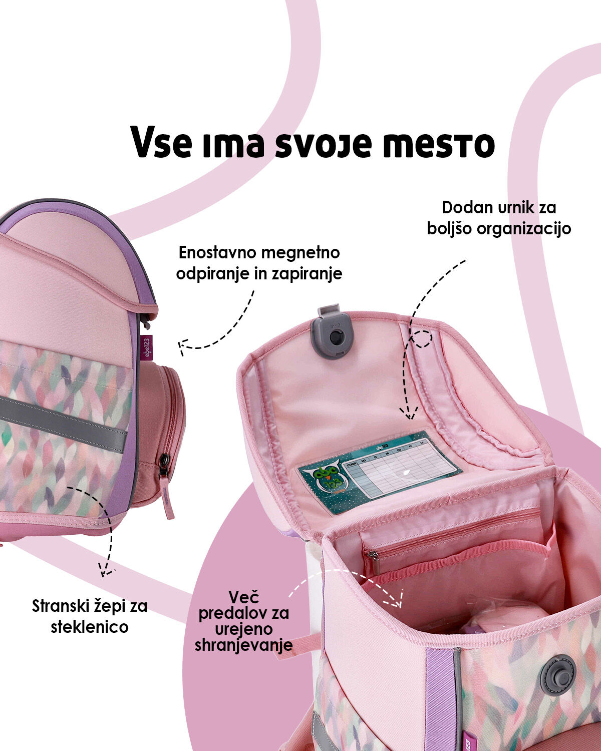 Torba ABC-123 nudi ergonomsko obliko, ki se prilagaja hrbtu vašega otroka. Tako bodo dnevi v šoli manj naporni, saj torba zmanjša pritisk na hrbet in ramena. Vaš otrok bo užival v udobju in se ne bo pritoževal nad težo.