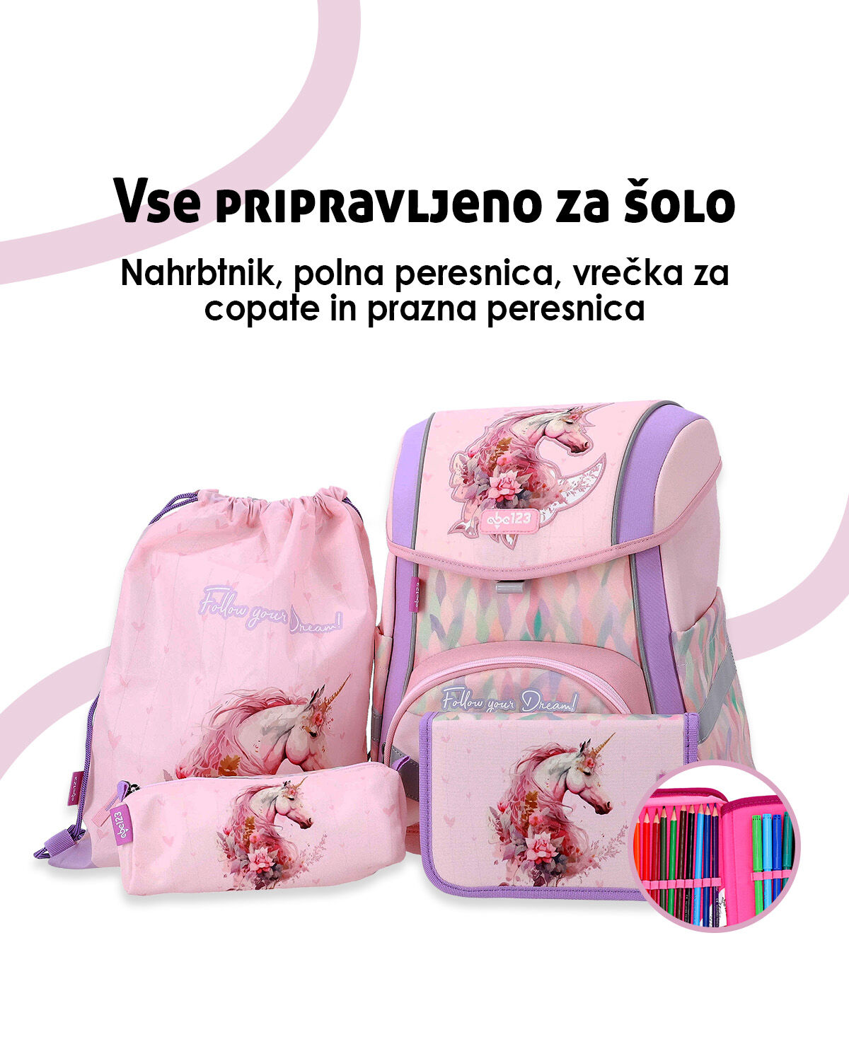 Šolska torba ABC-123 – 4-delni set, ergo premium, samorog