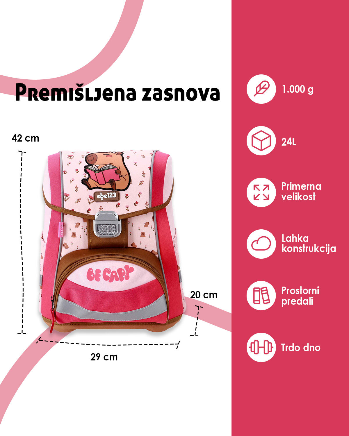 Torba ABC-123 je popolna izbira za šolarje, ki želijo stil in praktičnost. Uporabna za vsakdanjo šolo, z dovolj prostora za vse knjige in pripomočke. Z motivom kapibare bo vaš otrok izstopal med vrstniki.